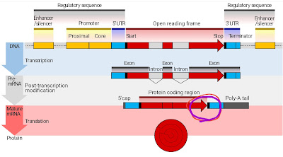 2) The raw transcript is processed. Some regions (introns) are snipped out, a "5' cap" is added at the head and a '"poly-A tail" stuck on the other end.